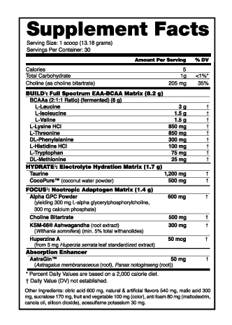 Alpha EAA is an efficaciously dosed essential amino acid formula that is unlike any other amino acid product out on the market today. Not only does Alpha EAA include a full-spectrum EAA matrix featuring 8.2 g of EAA’s and 6 g of fermented BCAA’s but we added a focus and hydration complex as well. It’s this focus matrix that really puts this product over the top and differentiates it from any amino based supplement available. Our focus matrix is comprised of a combination of the world’s most popular adaptogen, Ashwagandha KSM-66 and three of the most effective nootropics around, Alpha-GPC, VitaCholine and Huperzine A. To round out this novel formula and enhance it even more, we included taurine and CocoPure to support hydration and AstraGin to increase amino uptake and absorption.