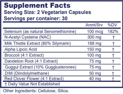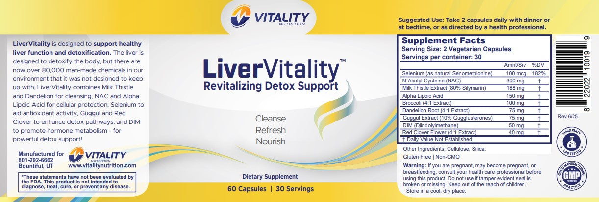 LiverVitality is designed to support healthy liver function and detoxification. The liver is designed to detoxify the body, but there are now over 80,000 man-made chemicals in our environment that it was not designed to keep up with. LiverVitality combines Milk Thistle and Dandelion for cleansing, NAC and Alpha Lipoic Acid for cellular protection, Selenium to aid antioxidant activity, Guggul and Red Clover to enhance detox pathways, and DIM to promote hormone metabolism - for powerful detox support!