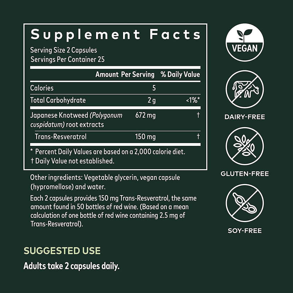Gaia Herbs Resveratrol 150 delivers a potent 150 mg dose of trans-resveratrol derived from Japanese Knotweed (Polygonum cuspidatum), providing the equivalent antioxidant power of 50 bottles of red wine — without the alcohol or sugar.* Resveratrol is a naturally occurring polyphenol celebrated for its ability to neutralize free radicals, support healthy aging, and promote cardiovascular health by encouraging endothelial function and healthy circulation.*